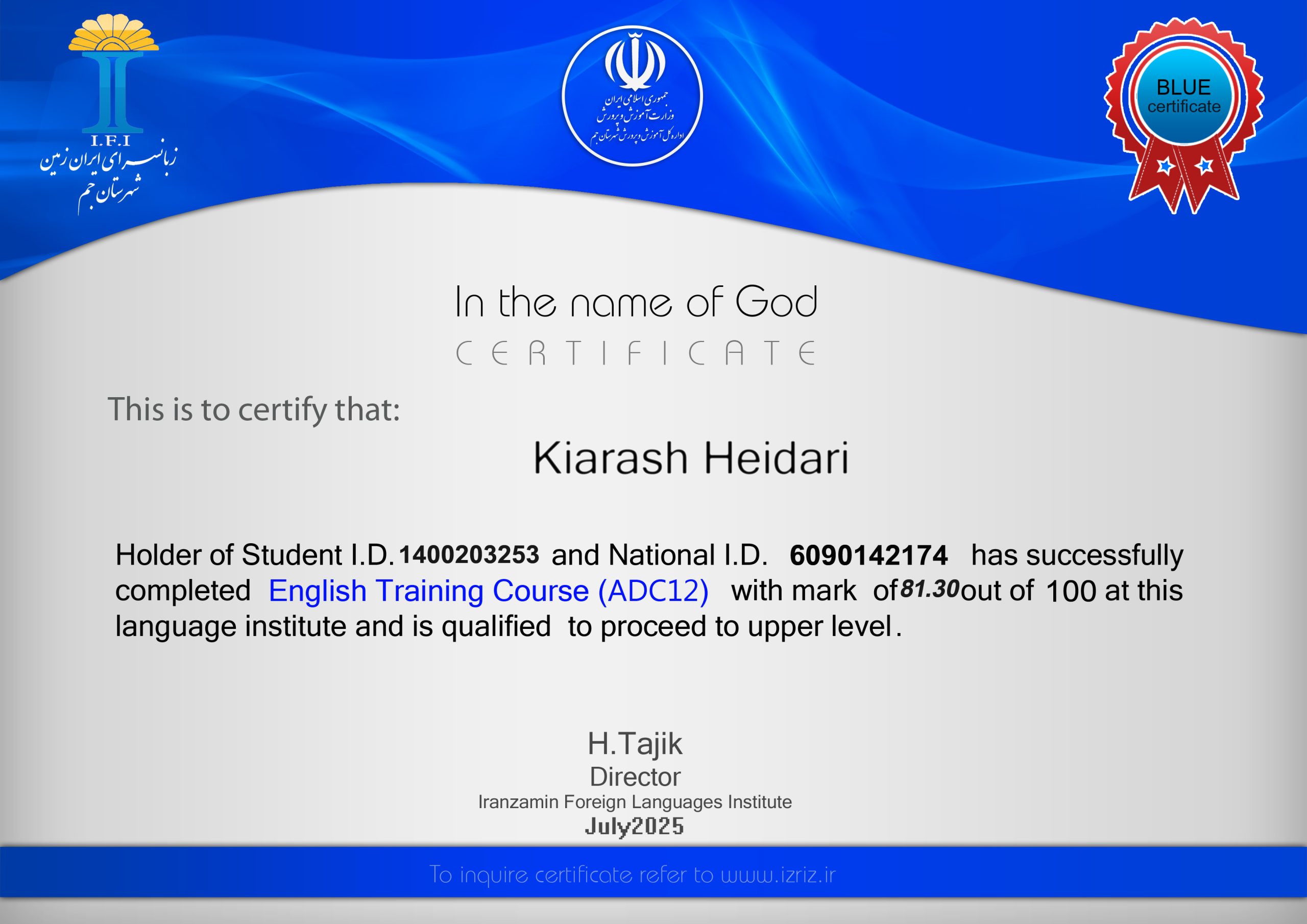 مدرک آبی مدرکی است که پس از پایان کتاب های فمیلی فرندز پس از گذراندن ۱۲ ترم به زبان آموزان اهدا می گردد. تلاش های این عزیزان را ارج می نهیم.