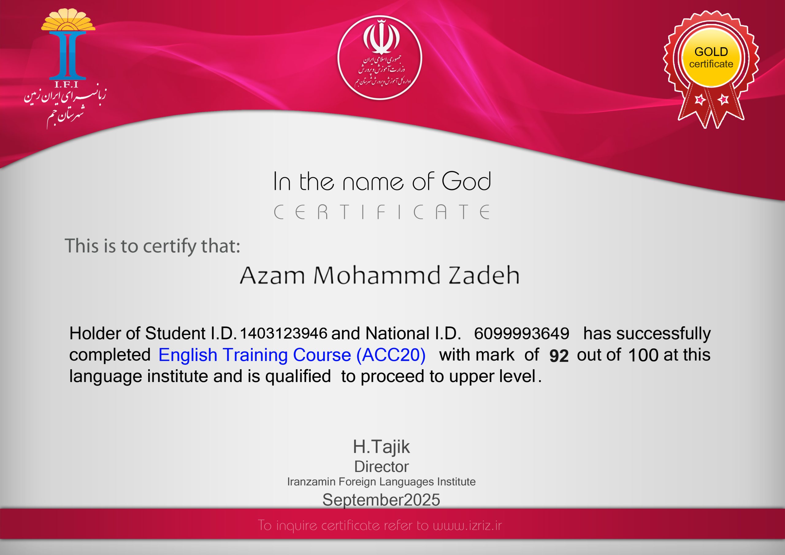 اسامی سری چهارم زبان آموزان دریافت کننده مدرک طلا زبانسرای ایران زمین