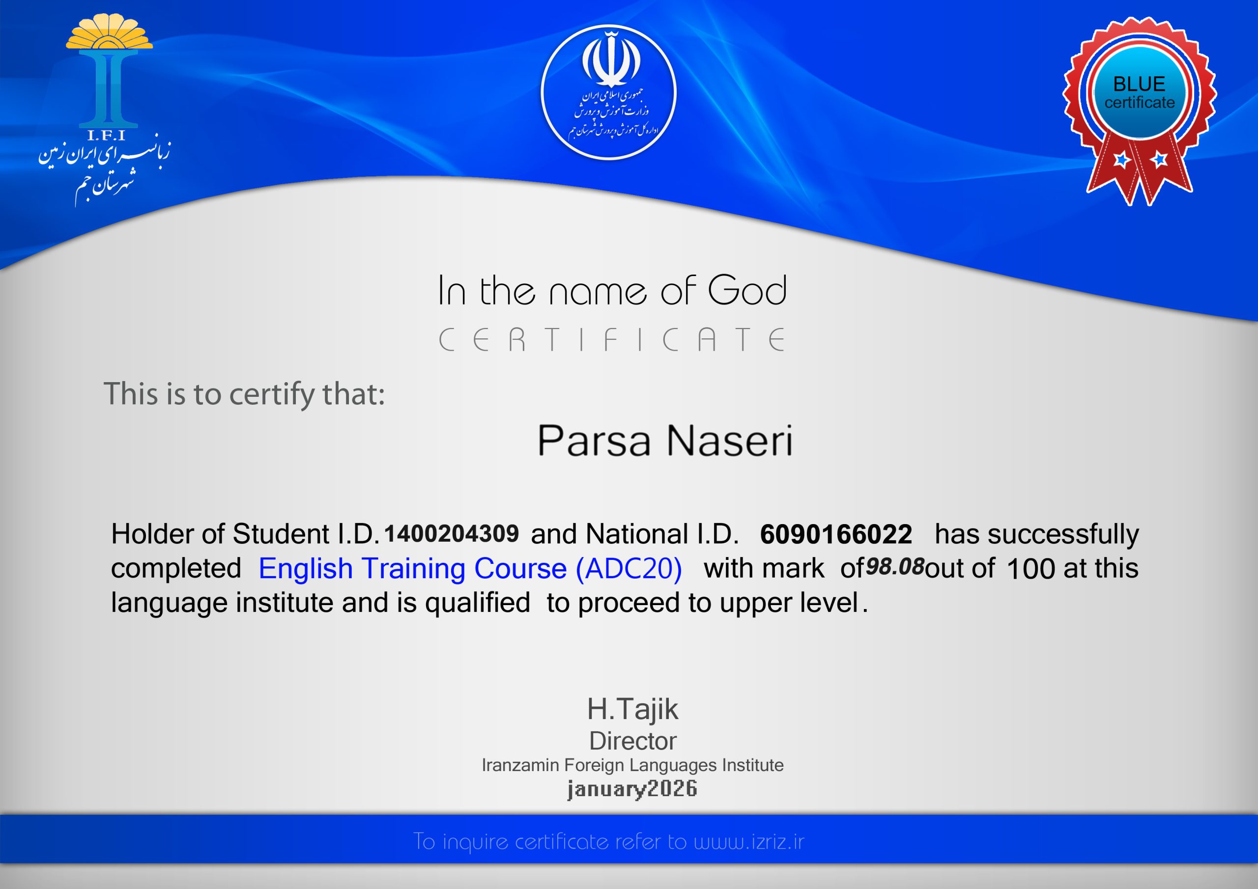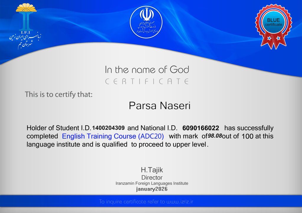 مدرک آبی مدرکی است که پس از پایان کتاب های فمیلی فرندز پس از گذراندن ۲۰ ترم به زبان آموزان اهدا می گردد. تلاش های این عزیزان را ارج می نهیم.